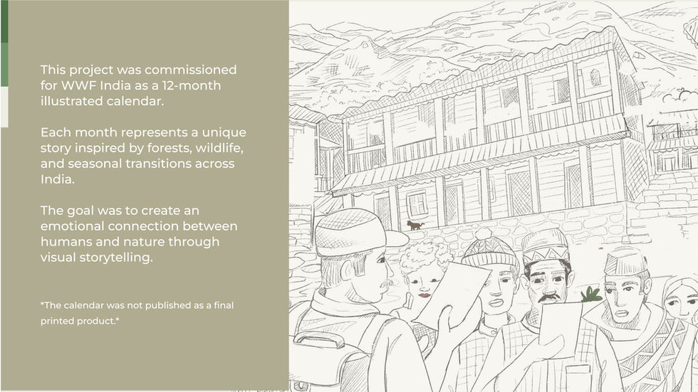 A 12-month illustrated calendar created for WWF India, exploring forests, wildlife, and human connection through visual storytelling.